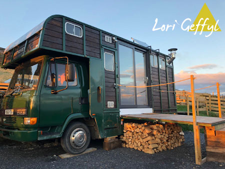 Mae llecyn o dir o flaen y lori a bwrdd picnic a lle i gynau tan yn ogystal a BBQ; pob dim i chi gael amser bendigedig gyda ni. Mae'r lori yn cysgu 4; un gwely dwbl bychan uwch ben y cab a'r llall yw'r sofa sydd yn agor allan yn wely dwbl bychan arall. Mae'r lori felly yn berffaith ar gyfer cyplau neu deuluoedd bychain. Mae cegin fach yn y lori ynghyd a chawod gynes a mae'r tu bach y tu allan. Ar ddiwedd y dydd cewch wylio film ar y projector 60 modfedd, neu chwarae gem o flaen tanllwyth o dan sydd yn y stof goed yn y lori.